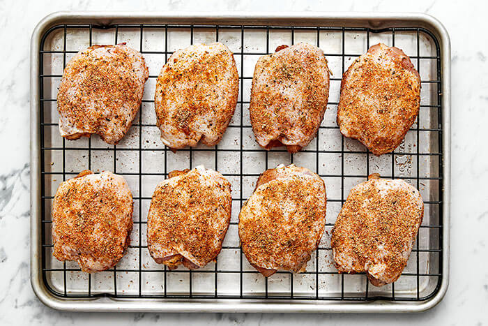 Prep the chicken for baking. Place the chicken thighs on a rack on top of a baking sheet. Then, sprinkle the remaining spice mix on top of the chicken. Feel free to gently pat down the seasoning so it sticks to each chicken thigh.