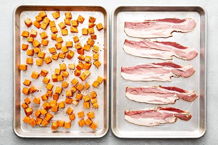 Bake the bacon and sweet potatoes. On another sheet pan, add slices of bacon. Then place both the sweet potato and bacon in the oven and cook for 15 to 20 minutes, or until the bacon is crispy. The bacon will be done first, so keep an eye on it and remove it from the oven when it's done, then place it on a paper towel-lined plate. Stir the sweet potato and continue cooking it for another 15 minutes.